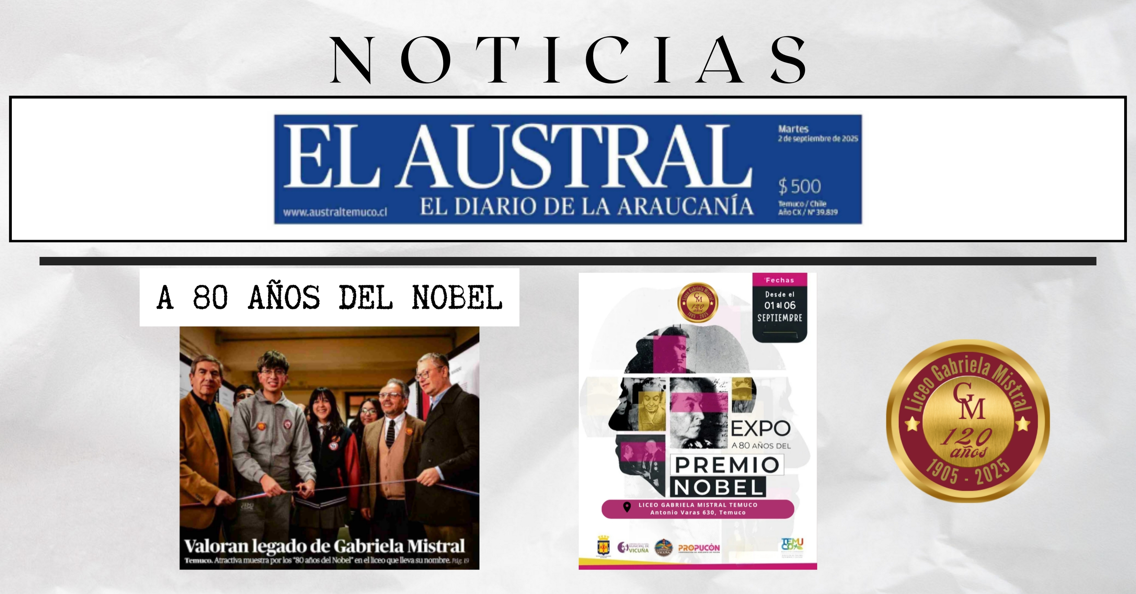 En el marco de la conmemoración de los 80 años del Premio Nobel de Gabriela Mistral, El Diario Austral de La Araucanía publicó una nota sobre la inauguración de la muestra realizada en el Liceo Gabriela Mistral – Temuco. Esta cobertura destaca el valor de nuestra poetisa y su huella permanente en la vida cultural y educativa de la región.